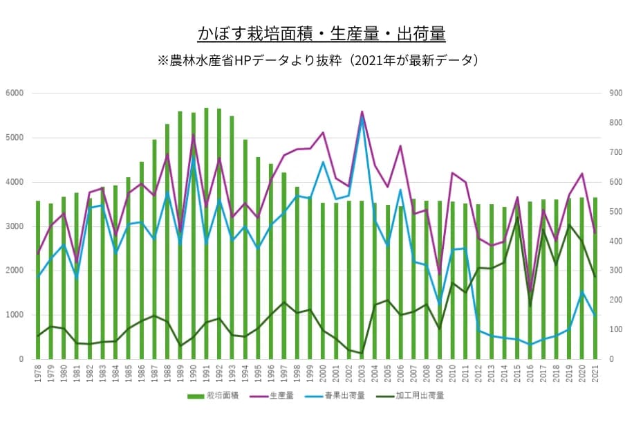 生産量推移は農業生産法人の就農により横ばいですが、高齢化(後継者不足)や夏場の暑さに課題があり、従来よりかぼす農家が減少しております。